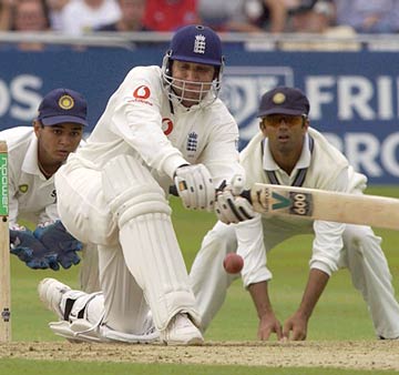 Mark Butcher, who scored 53, prepares to sweep Harbhajan.