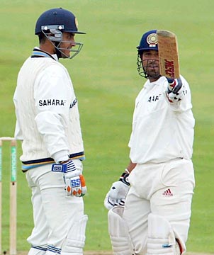 Tendulkar waves to the balcony after completing his 30th Test century.