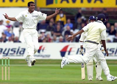 Zaheer Khan celebrates after sending back Andrew Flintoff for another duck.