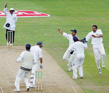 Anil Kumble celebrates as Hussain offers a bat-pad catch to Virender Sehwag.