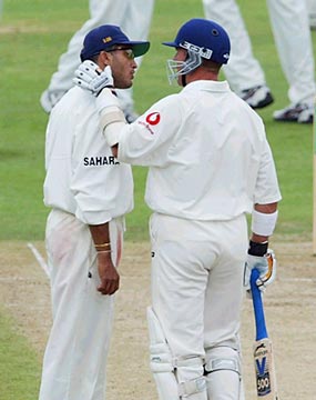 Alec Stewart exchanges words with Ganguly after he appealed unsuccessfully for a leg before decision.