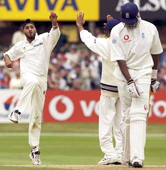 Harbhajan Singh celebrates after claiming the wicket of Alex Tudor. It was the spinner's only wicket of the England second innings.