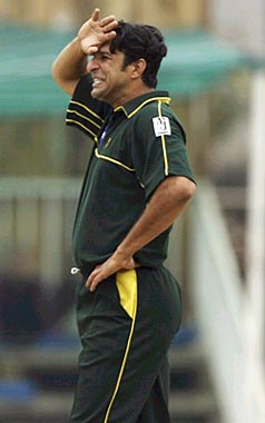 Pakistan bowler Wasim Akram shows his frustration after having an LBW appeal turned down.
