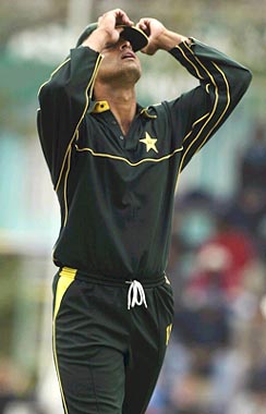 Ace Pakistan paceman Shoaib Akhtar feels the strain after being hit for 21 runs off one over