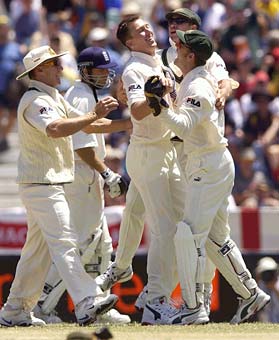 McGrath of Australia is congratulated after running out Michael Vaughan.