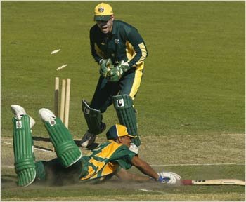 Ryan Campbell of Australia 'A' unsuccessfully attempts to run out Makhaya Ntini of South Africa off the last ball of the SA innings.