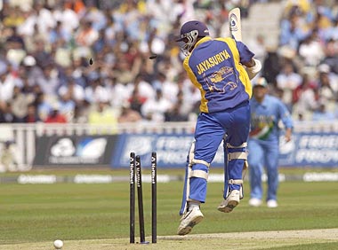 Sri Lankan skipper Sanath Jayasuriya drags a delivery from Ashish Nehra back onto his stumps for 22.