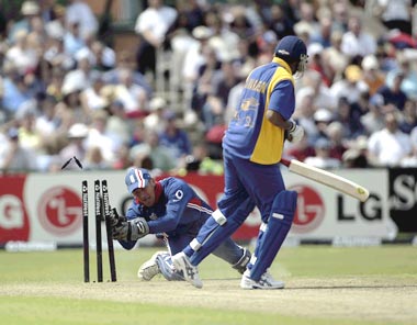 Alec Stewart stumps Thilan Samaraweera off Michael Vaughan. The last six Sri Lankan wickets fell for 25 runs.