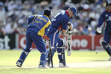 Andy Flintoff finds his stumps disturbed by a Sanath Jayasuriya delivery.
