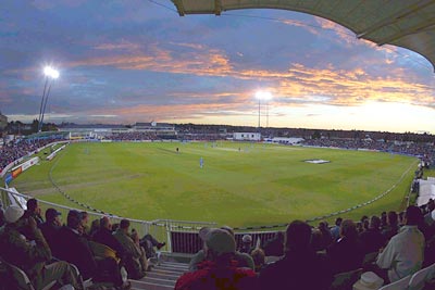 A wide-angled view of the stadium as the lights are switched on during the course of the day-night match.