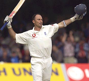 Nasser Hussain celebrates after getting his century.