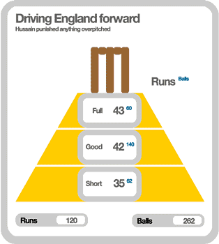 Hussain scratched around a bit at first. Before lunch he was in control of just 70% of his strokes, but between lunch and tea that inched up to 81% as he and John Crawley opened their shoulders and took charge. He also continued the remarkable run of form of England’s No. 3 batsman. The position used to be a bit of a poisoned chalice, but Hussain’s hundred followed innings of 105, 94 and 123 by Mark Butcher in the Sri Lanka series. Then there was Hussain’s hundred in the NatWest Series final on this ground. At least he didn’t point to his back this time.