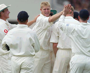England bowler Matthew Hoggard celebrates getting the wicket of India's leading batsman Rahul Dravid during the third day of the first Test at Lord's.