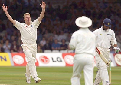 India captain Sourav Ganguly walks back to the pavilion after being caught by Michael Vaughan (not in picture) off the bowling of Andrew Flintoff.
