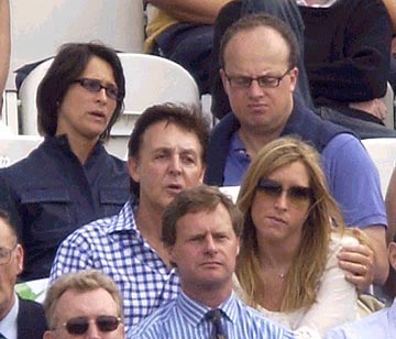 'Beatle' Paul McCartney and his new wife Heather watch the action at Lord's on day 3.