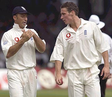 England captain Nasser Hussain talks tactics with new boy Simon Jones.
