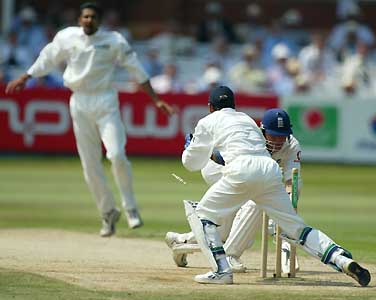 Alec Stewart came in at the fall of Vaughan's wicket and did his bit, scoring a brisk 33.