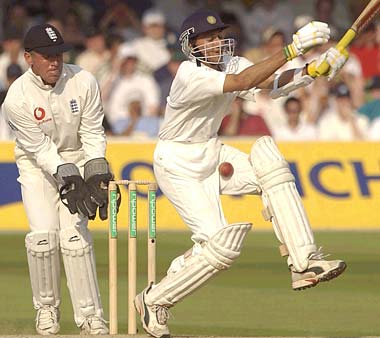 Ajit Agarkar batted doggedly despite being hit by the ball during the fifth day of the first Test between India and England at Lord's. England won the Test by 170 runs and went one up in the four-Test series.