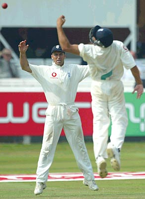 England captain Nasser Hussain watches as Mark Butcher nearly catches VVS Laxman.