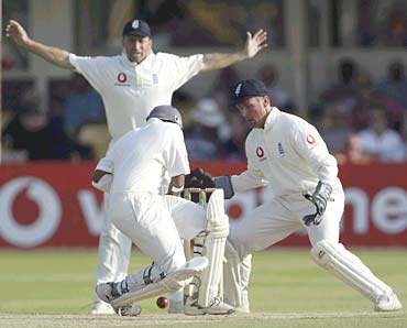 Nasser Hussain is about to celebrate as Jayawardene tries to stop a ball from giong back to the stumps, while Alec Stewart looks on impatiently.