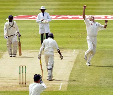 Andrew Caddick celebrates the wicket of Mahela Jayawardene for 59.