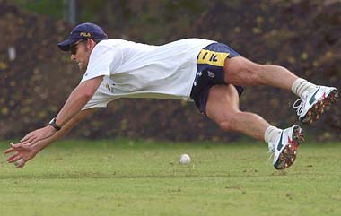 Adam Gilchrist of Australia dives for the ball during Australian cricket team training at Allan Border Field in Brisbane, Australia. The Australian team are in Brisbane to train in preperation for the Tower Super Challenge one day cricket series against Pakistan.
