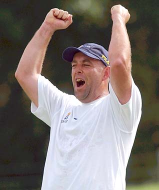 Darren Lehmann of Australia celebrates a run out during Australian cricket team training at Allan Border Field in Brisbane, Australia. The Australian team are in Brisbane to train in preperation for the Tower Super Challenge one day cricket series against Pakistan.