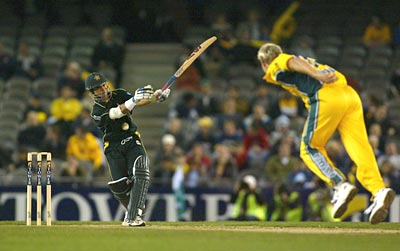 Pakistan opener Imran Nazir, who was unbeaten with 39 runs, is struck by a delivery from Shane Watson.