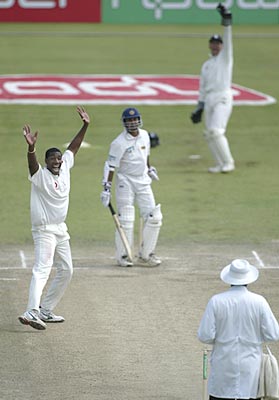 Alex Tudor appeals for the wicket of Kumar Sangakkara, and gets it, on Day 5 of the 3rd and final npower Test at the Old Trafford, Manchester.