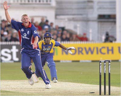 Russel Arnold was dismissed when Sangakarra played a straight drive that met bowler Matthew Hoggard's fingers on its way to dislodging the bails at the non-striker's end. The dismissal ended all hopes of a Lankan win.