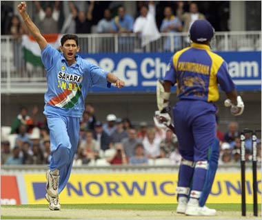 Opener Romesh Kaluwitharana edged Ajit Agarkar to keeper Rahul Dravid as Sri Lanka lost their first wicket for 42.