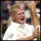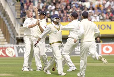 Matthew Hoggard celebrates getting the early wicket of Marvan Atapattu after he was caught behind by Alec Stewart for 13.