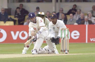 Michael Vaughan smashes the ball to the boundary on his way to 46.