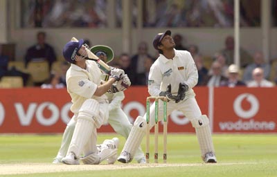 Michael Vaughan tries to sweep a ball by Muralitharan only to end up being caught by Sanath Jayasuriya for 46.
