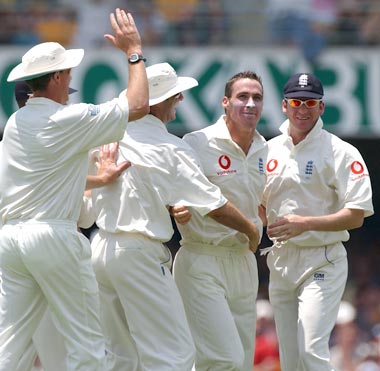 England fast bowler Simon Jones was impressive as he claimed the only wicket, that of Langer, to fall in the first two sessions of the day.