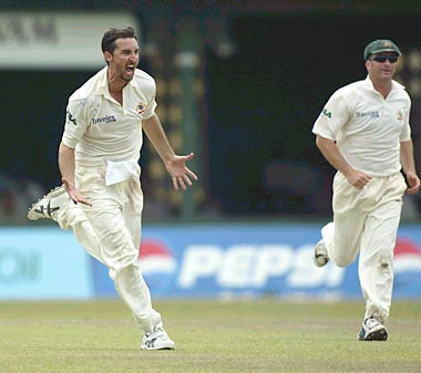 Gillespie is seen at his wildest as he dismisses the Pakistan captain Waqar Younis for 1.
