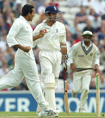 Michael Vaughan walks back to the pavilion dejectedly after getting out for 195 in the morning on day 2 in the fourth Test between England and India at The Oval.