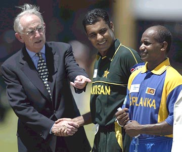 ICC president Malcolm Gray greets Pakistan captain Waqar Younis and Sri Lanka captain Sanath Jayasuriya before the opening game of the ICC Champions Trophy at the Premadasa stadium on Thursday.
