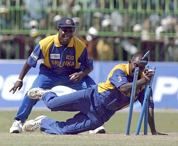 P Gunaratne takes off the bails to run-out Pakistan batsman Yousuf Youhana [not in picture].