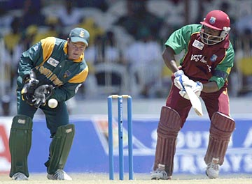 South Africa keeper Mark Boucher watches as Brian Lara plays the ball through the leg side.