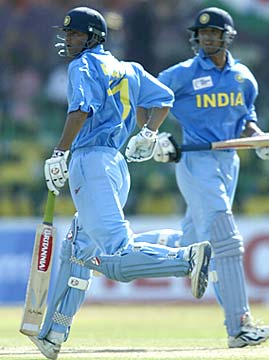 Mohammad Kaif, who along with Dravid, lifted India from the dumps after the top order had gone cheaply, runs to complete the hundred run partnership.