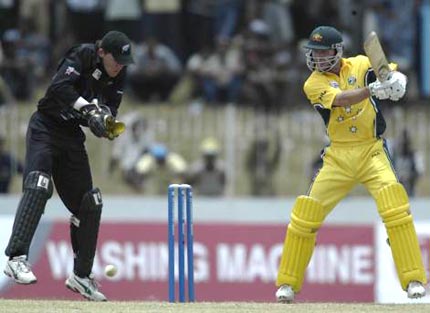 New Zealand wicketkeeper Lou Vincent watches as Damien Martyn executes a square cut on way to a half century.