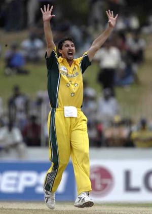 Jason Gillespie exults after trapping opener Nathan Astle leg before wicket for nought in the second over of the innings.