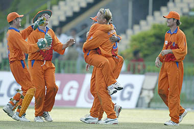 A spectacular one-handed catch by De Leede, running towards the boundary rope, saved six and accounted for Aravinda de Silva for 23. De Leede is congratulated by bowler Adeel Raja.