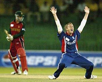 Dominic Cork appeals unsucessfully for the wicket of Andy Flower.