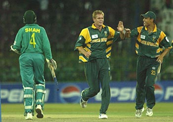 Shaun Pollock celebrates after taking the wicket of Ravindu Shah.
