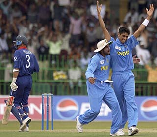 Nehra gets a pat on the back from Harbhajan Singh after claiming the wicket of England captain Nasser Hussain.