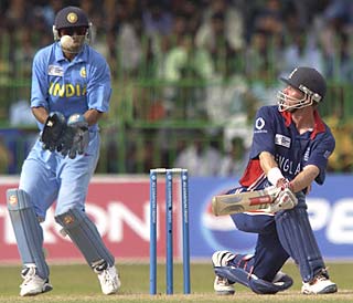 India wicketkeeper Rahul Dravid anticipates a catch as Nick Knight sweeps.