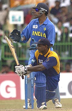 Sri Lanka captain Sanath Jayasuriya hits out during the final of the ICC Champions Trophy between India and Sri Lanka at the Premadasa Stadium, Colombo, Sri Lanka.