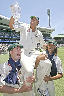 Retiring spin bowler Warne holds the Ashes trophy aloft as he is carried by teammates Michael Clarke and Andrew Symonds on a farewell victory lap.